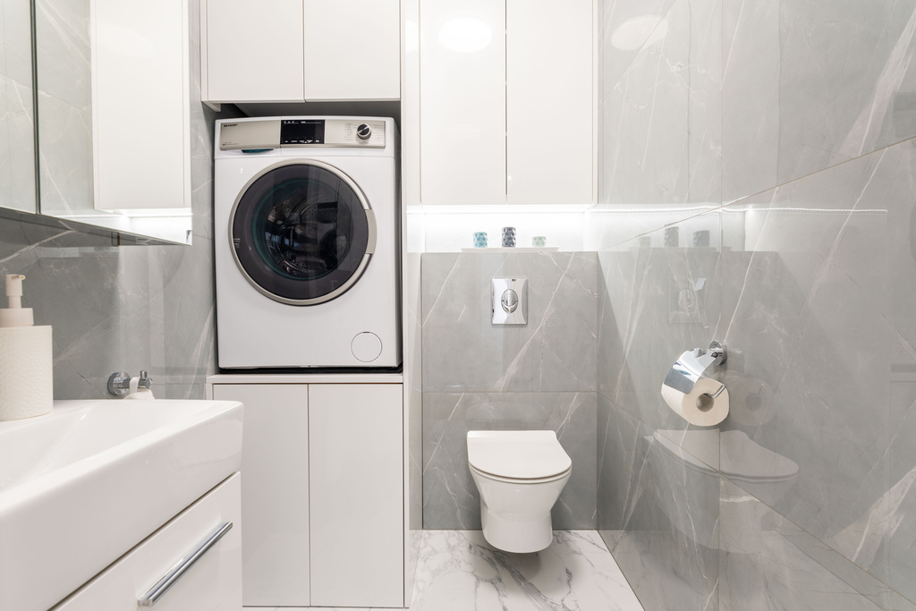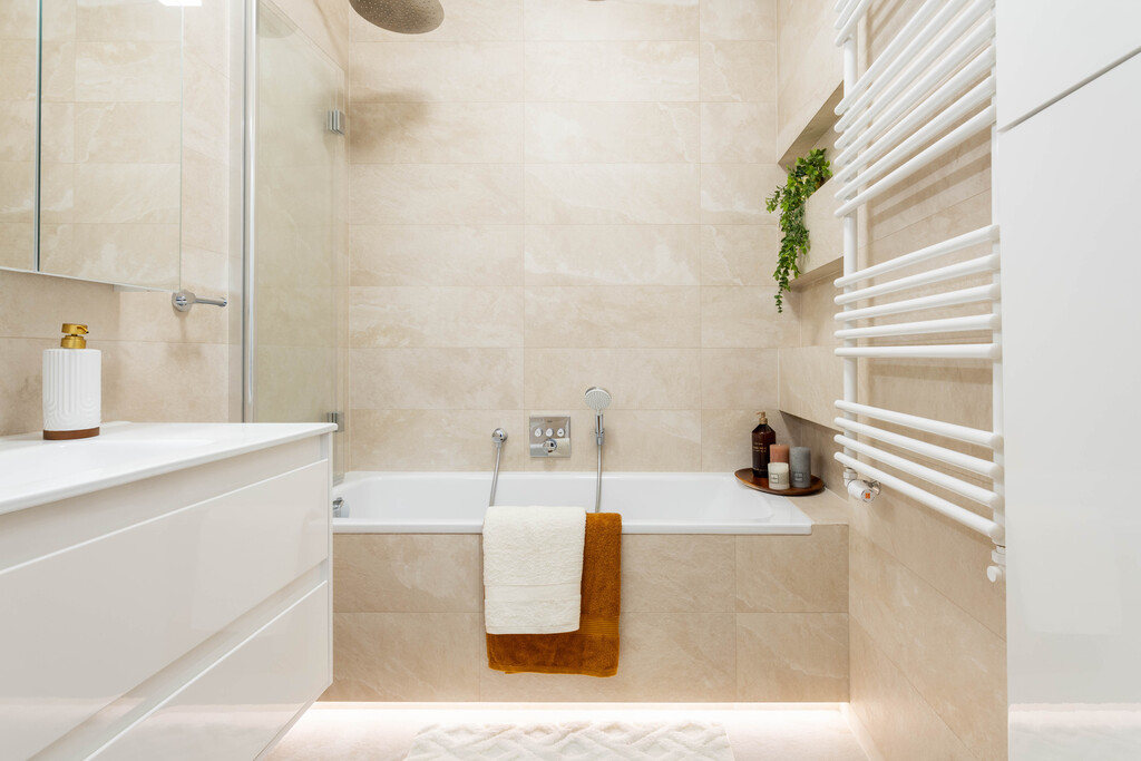 – Bathroom with a bathtub (with shower option), finished in an elegant style.
