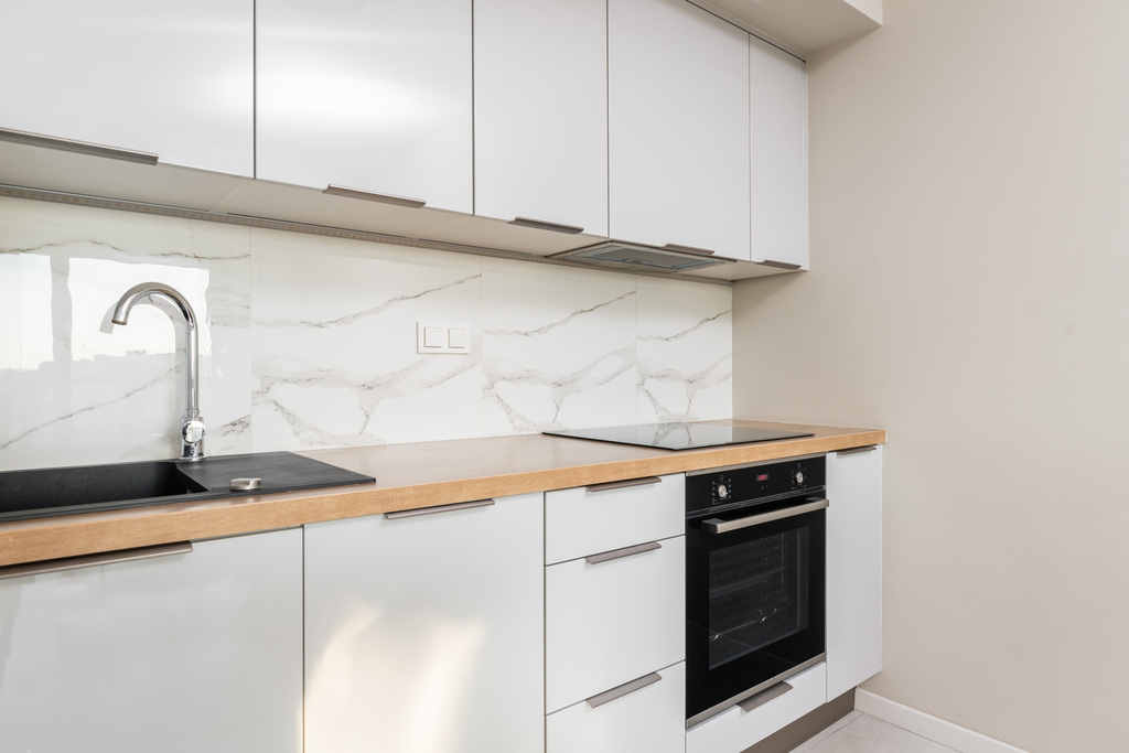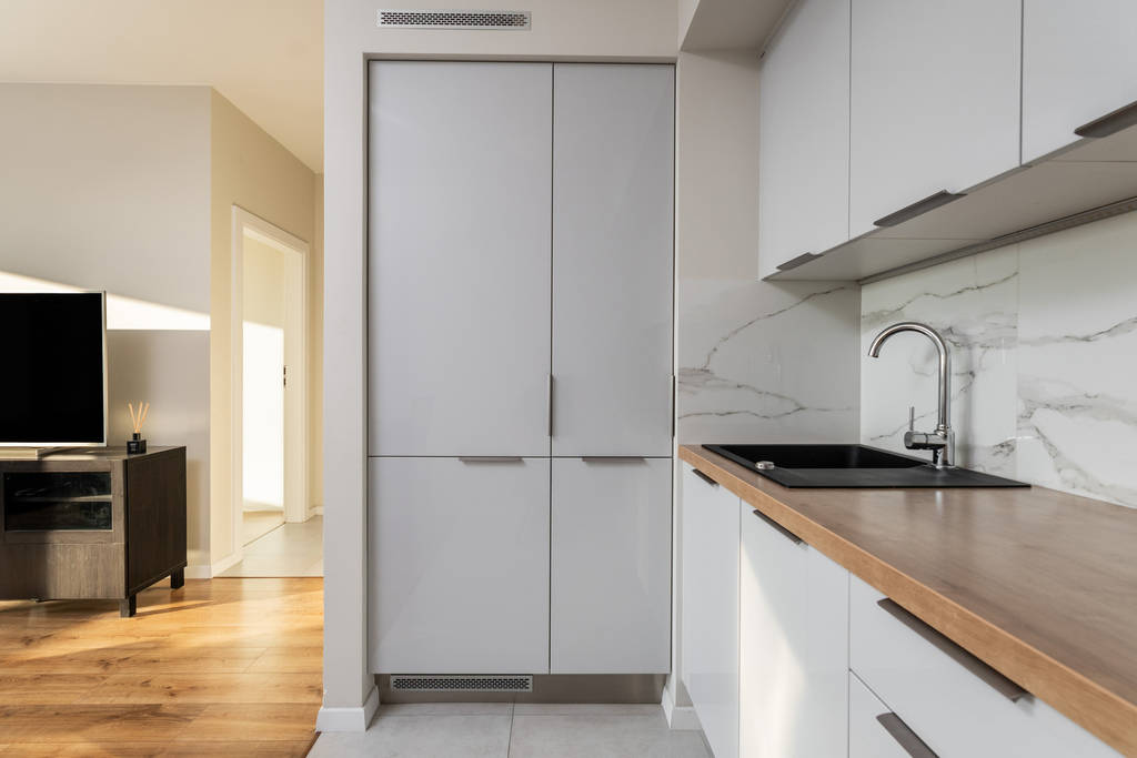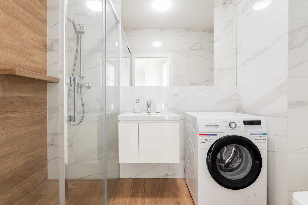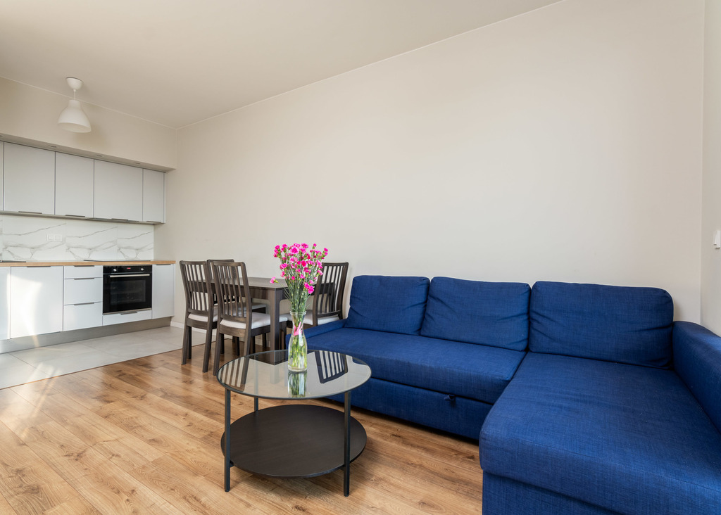 Mieszkanie w pełni wyposażone, tj.: pralka, zmywarka, płyta indukcyjna, piekarnik, lodówka z zamrażarką, telewizor, odkurzacz, deska do prasowania.