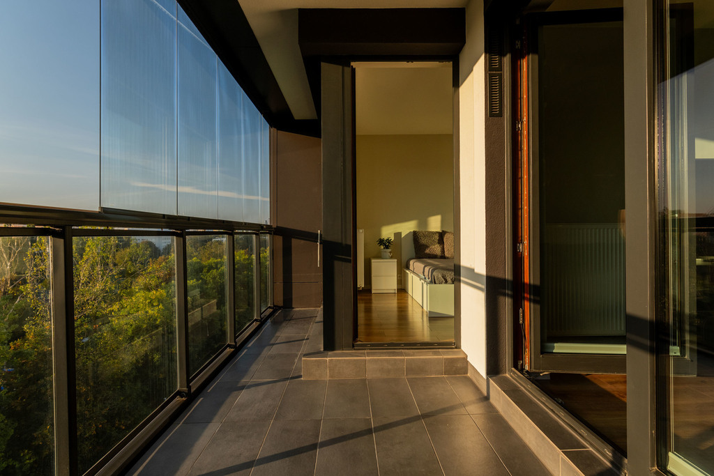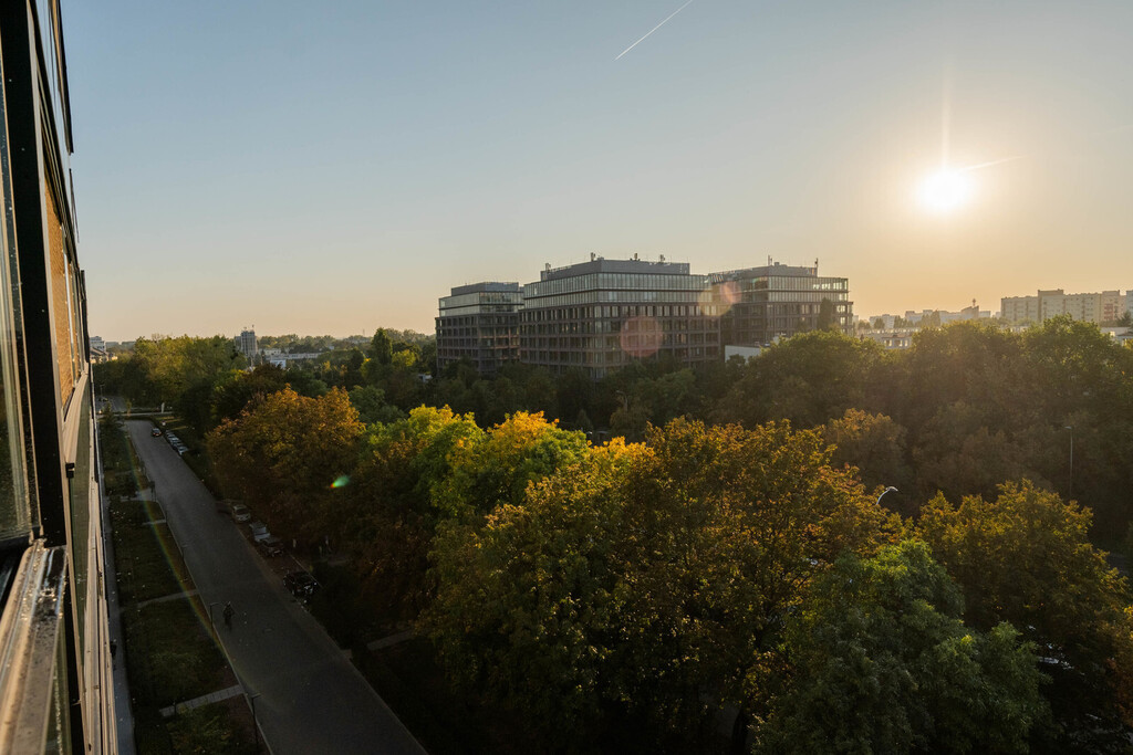 Piękny widok na zieleń, kilka wieżowców i zachód słońca- brak sąsiadów naprzeciwko.